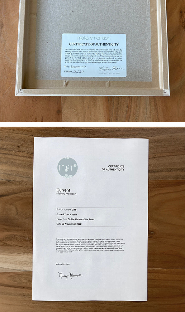 A Certificate of Authenticity verifies that it's an original "Mallory Morrison". It adds transparency and value to the limited edition print.