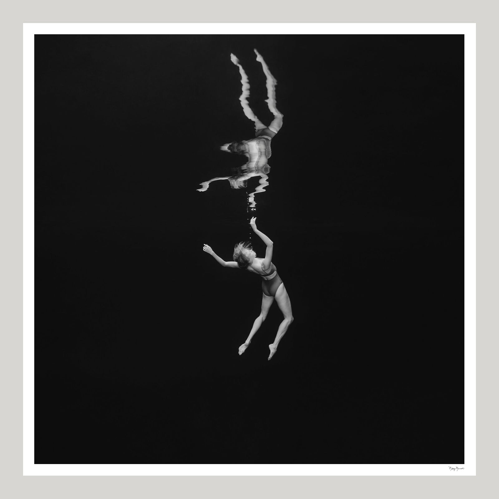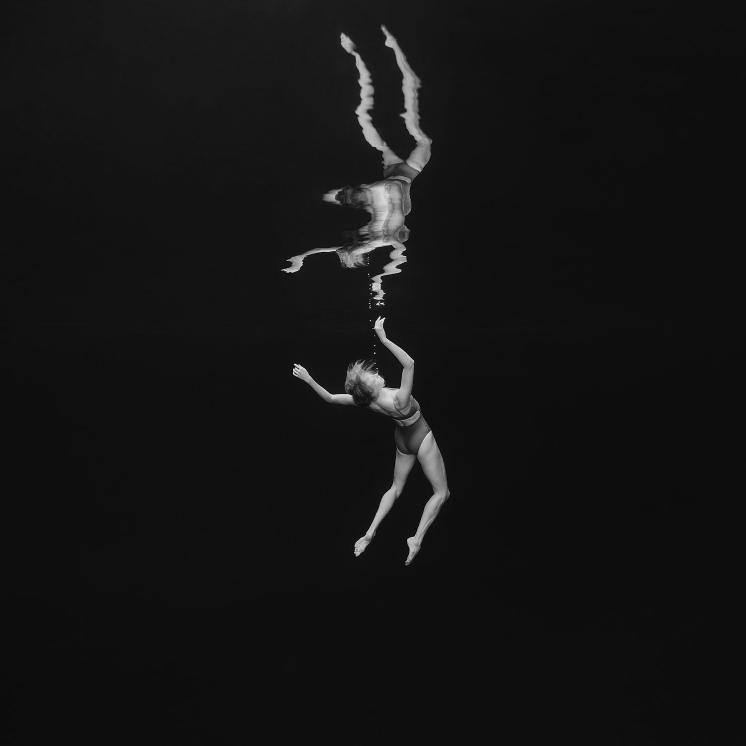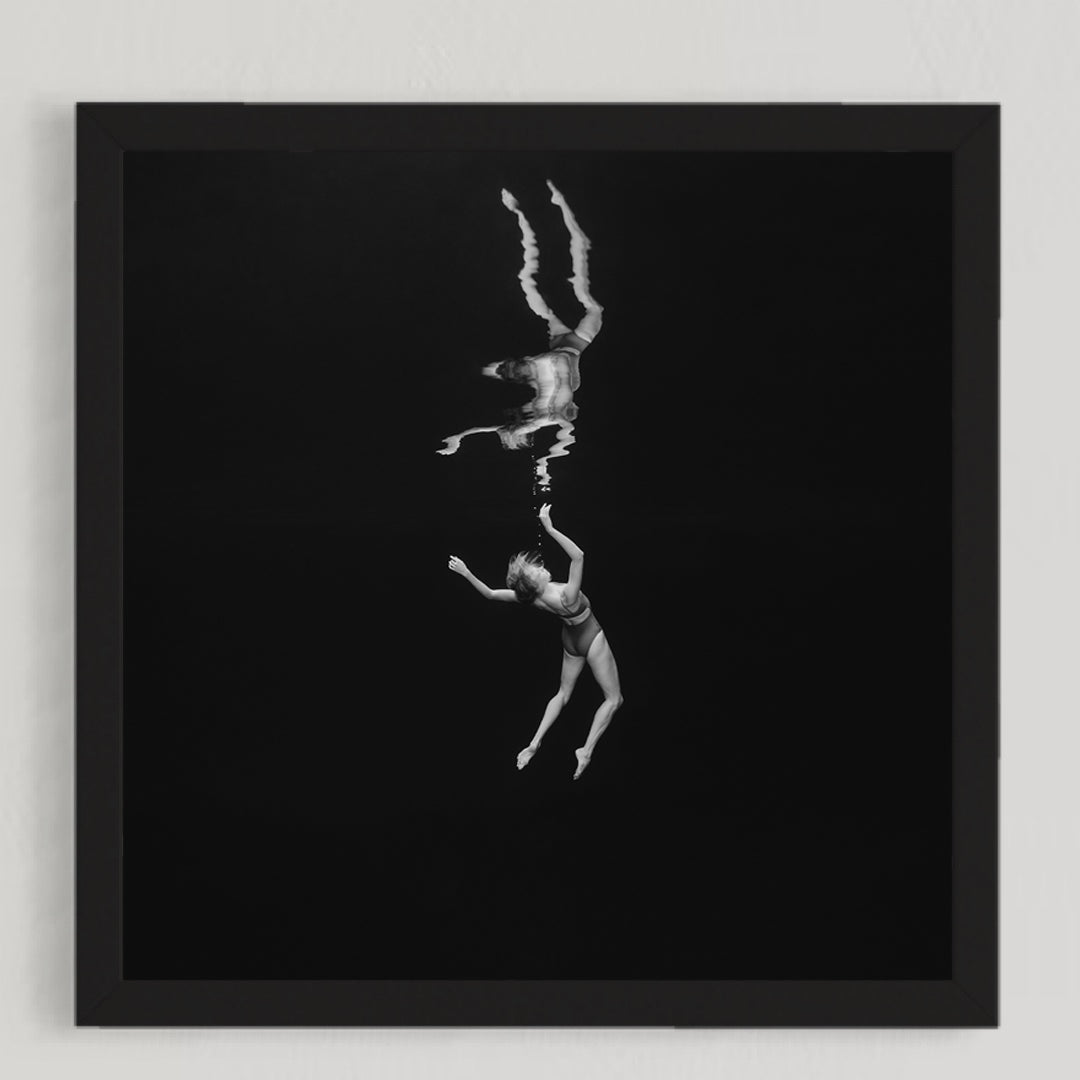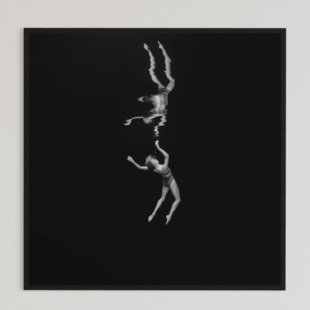 Suspended in quiet stillness, she surrenders to intuition and release, finding freedom in the vast space around her.