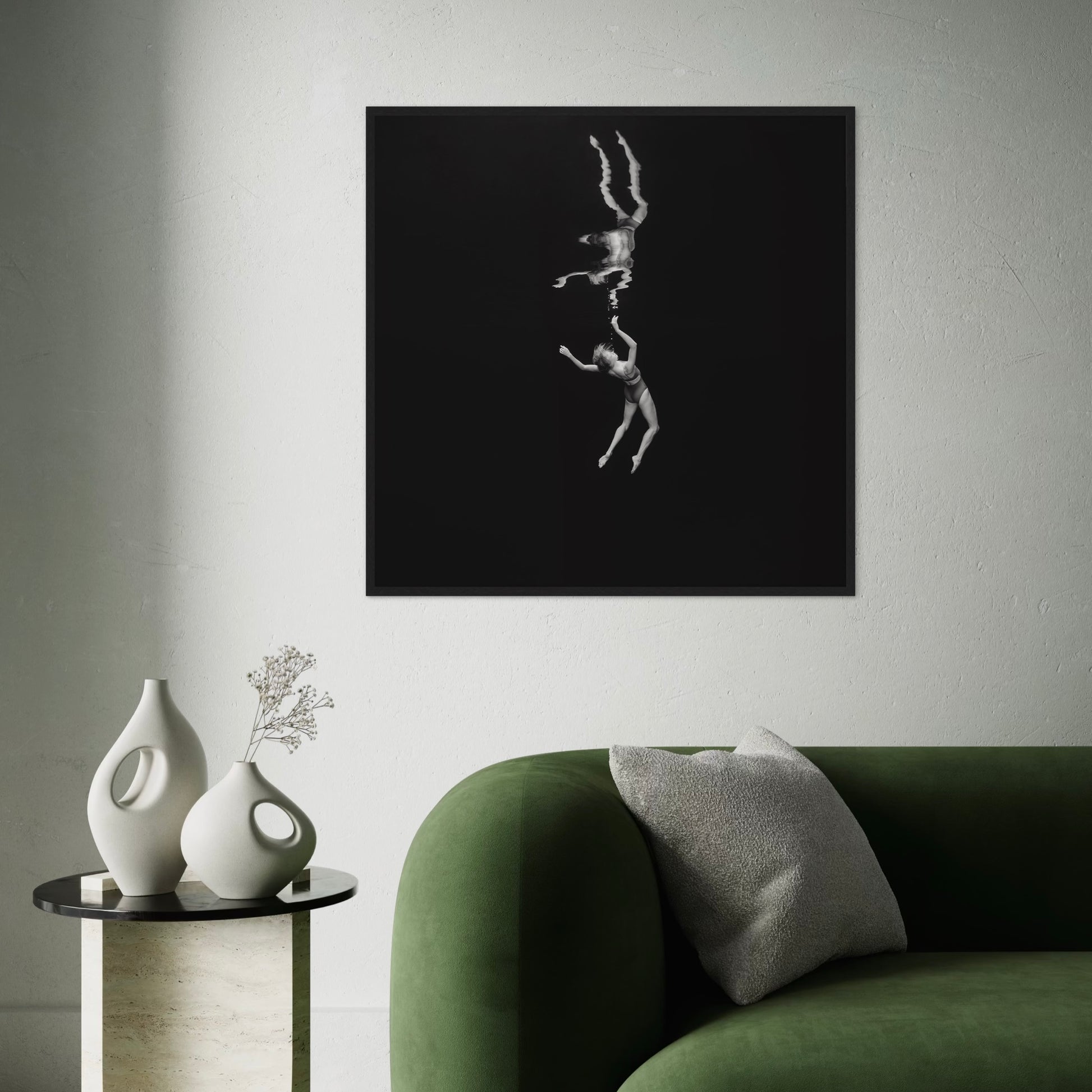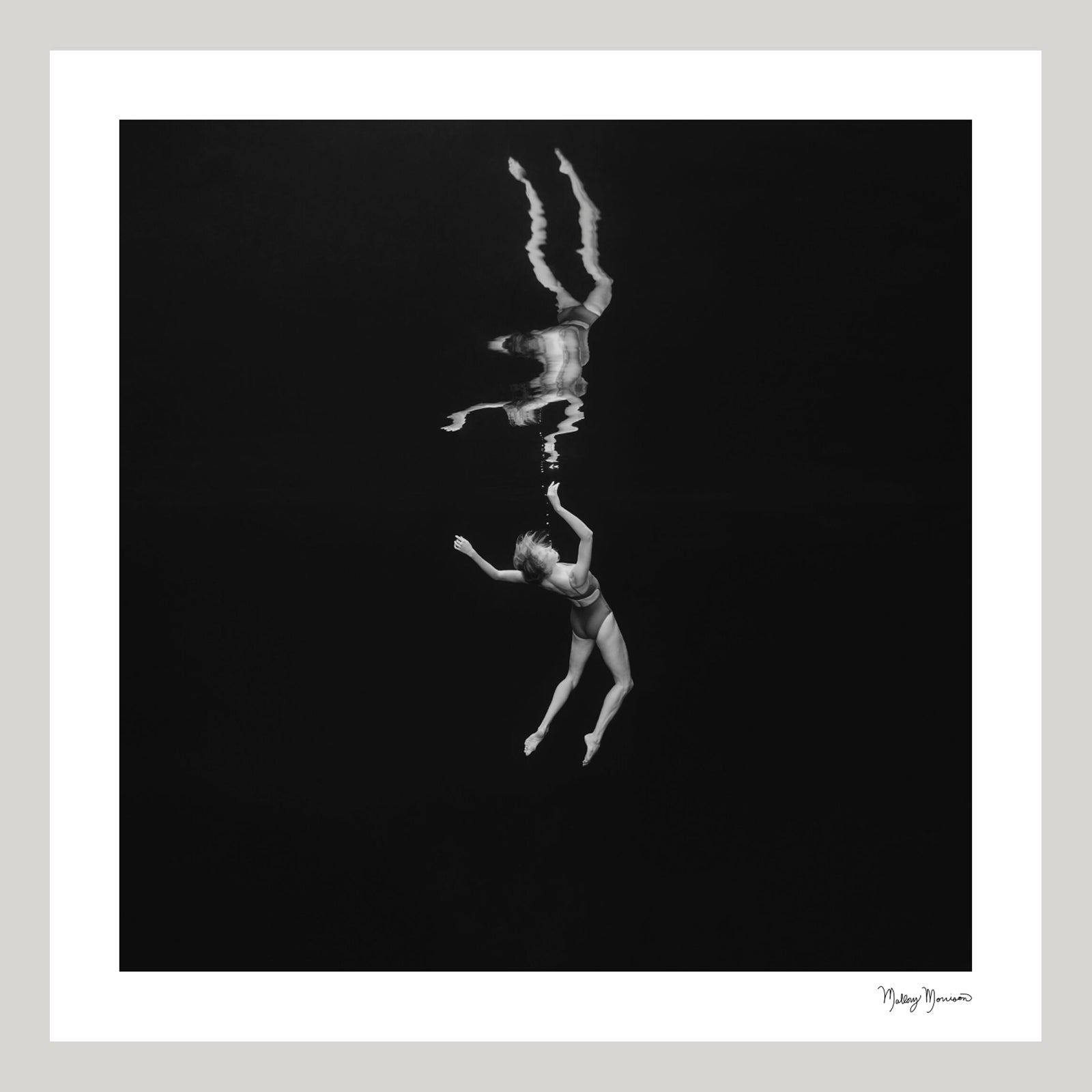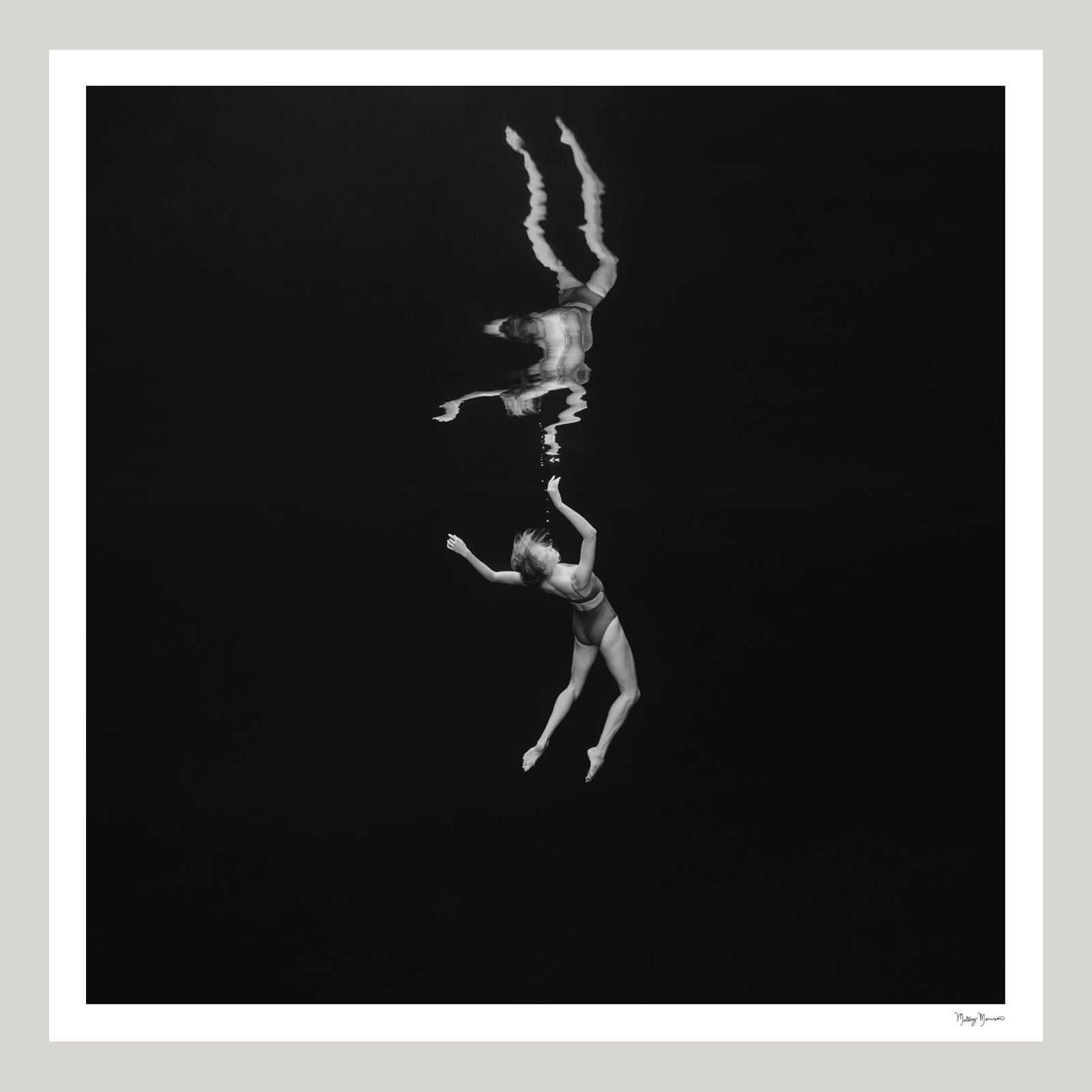 Suspended in quiet stillness, she surrenders to intuition and release, finding freedom in the vast space around her.